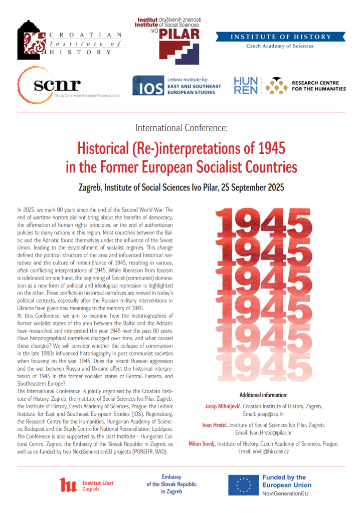 Hrvatski institut za povijest s nekoliko partnerskih znanstvenih institucija organizira međunarodnu konferenciju “Historical (Re-)interpretations of 1945 in the Former European Socialist Countries” koja će se održati 25. rujna na Institutu društvenih znanosti Ivo Pilar.